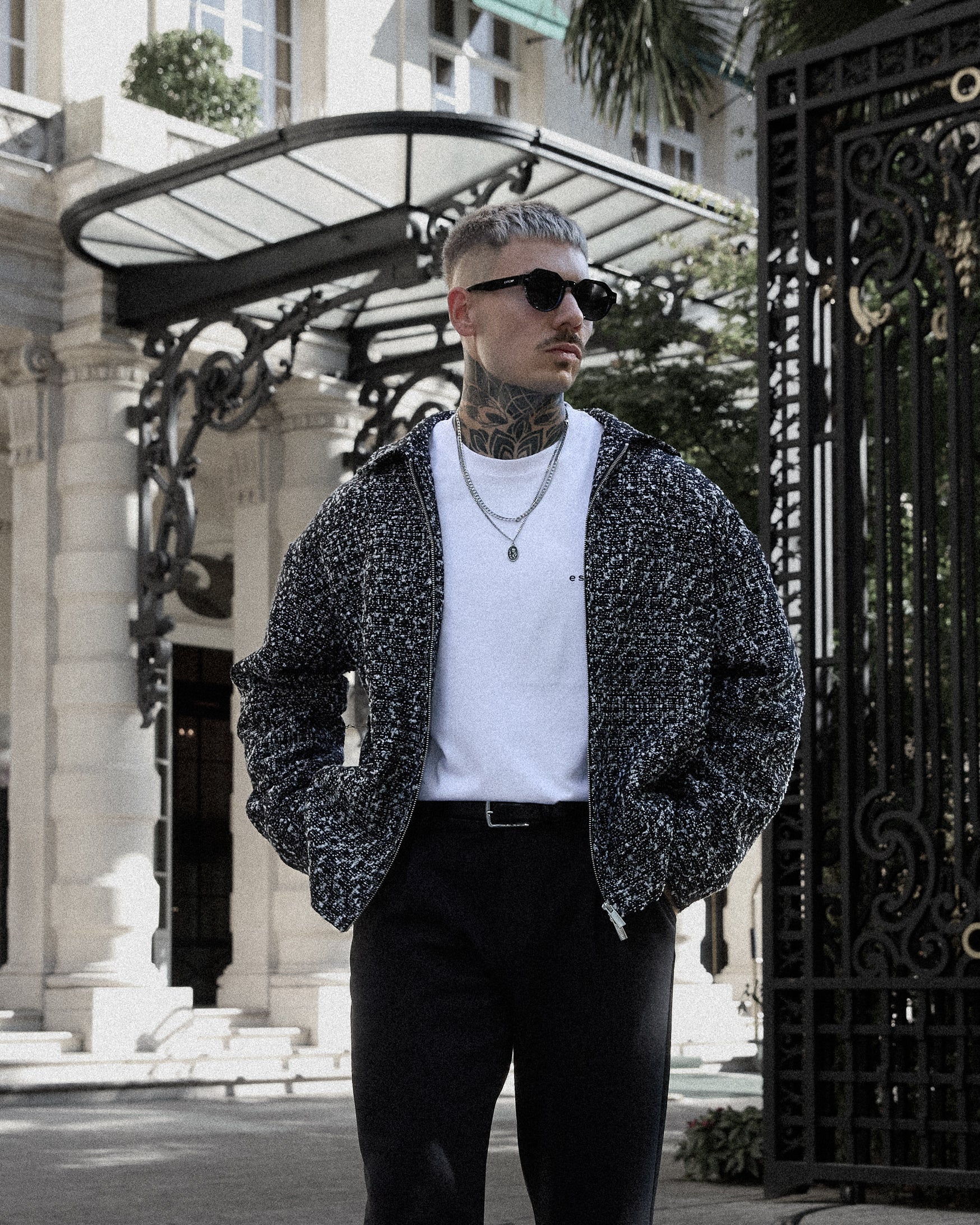 A bold silhouette defined by attention to detail: oversized fit, exposed seam lines, and refined tonal embroidery at the collar.