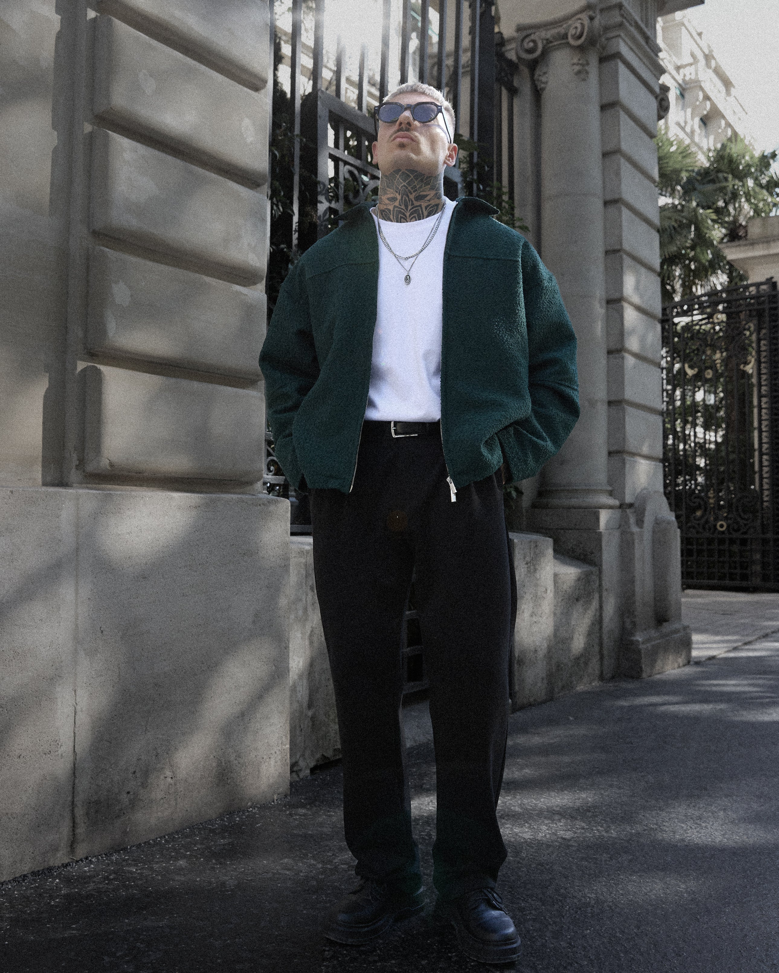 A bold silhouette defined by attention to detail: oversized fit, exposed seam lines, and refined tonal embroidery at the collar.