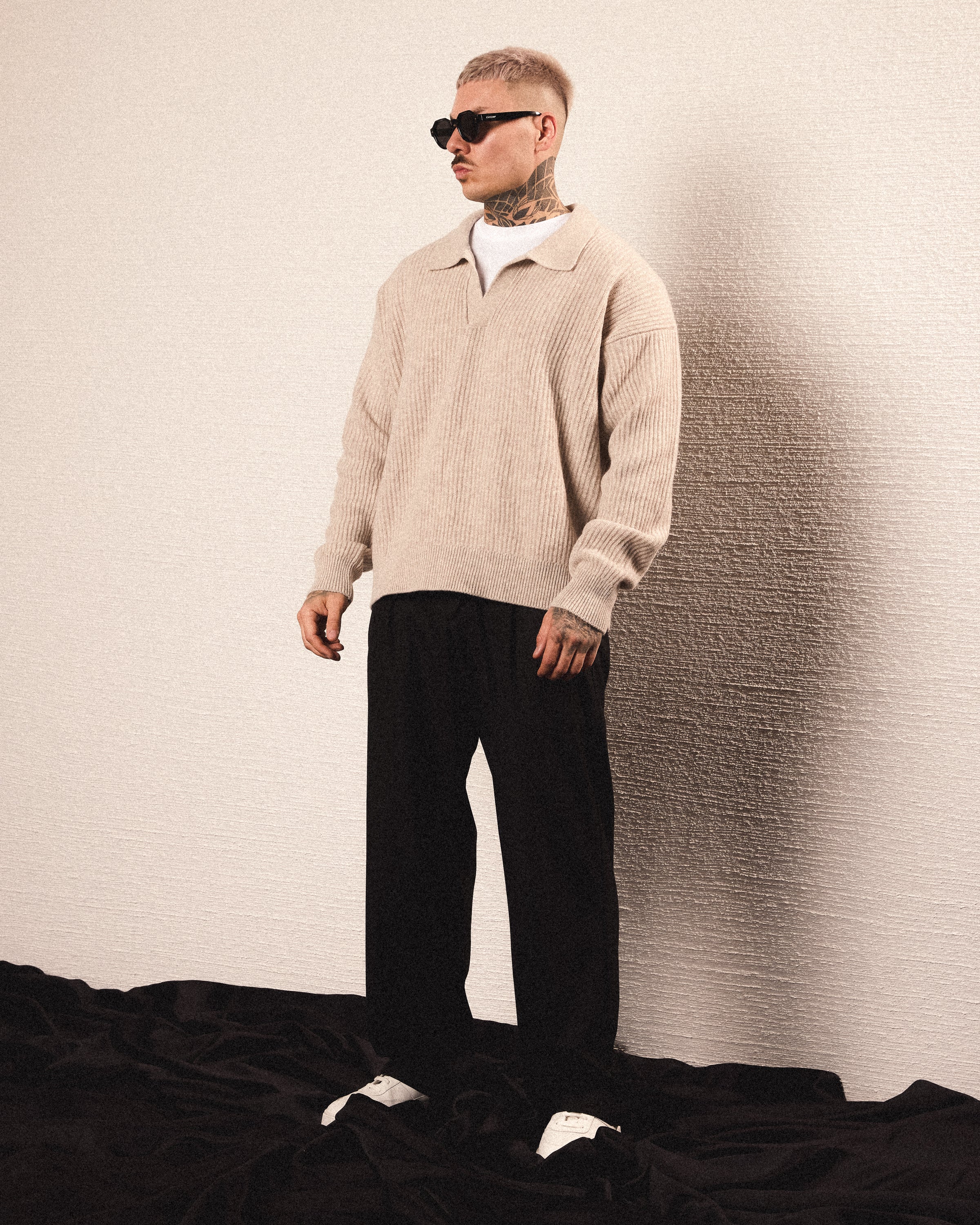 GREIGE OVERSIZED KNIT POLO SWEATER