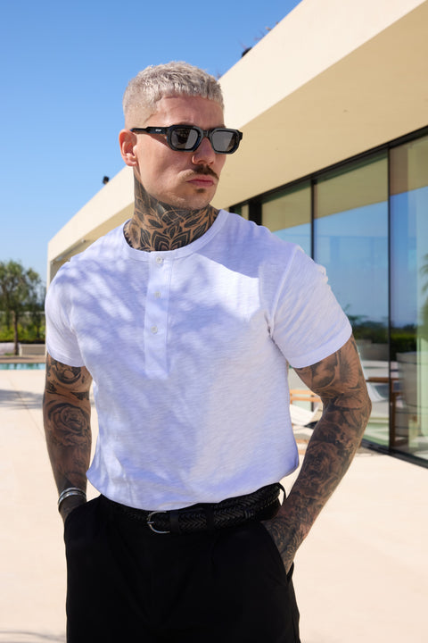 Henley aus reiner Flammgarn-Baumwolle – leicht, mit markanter Oberfläche.