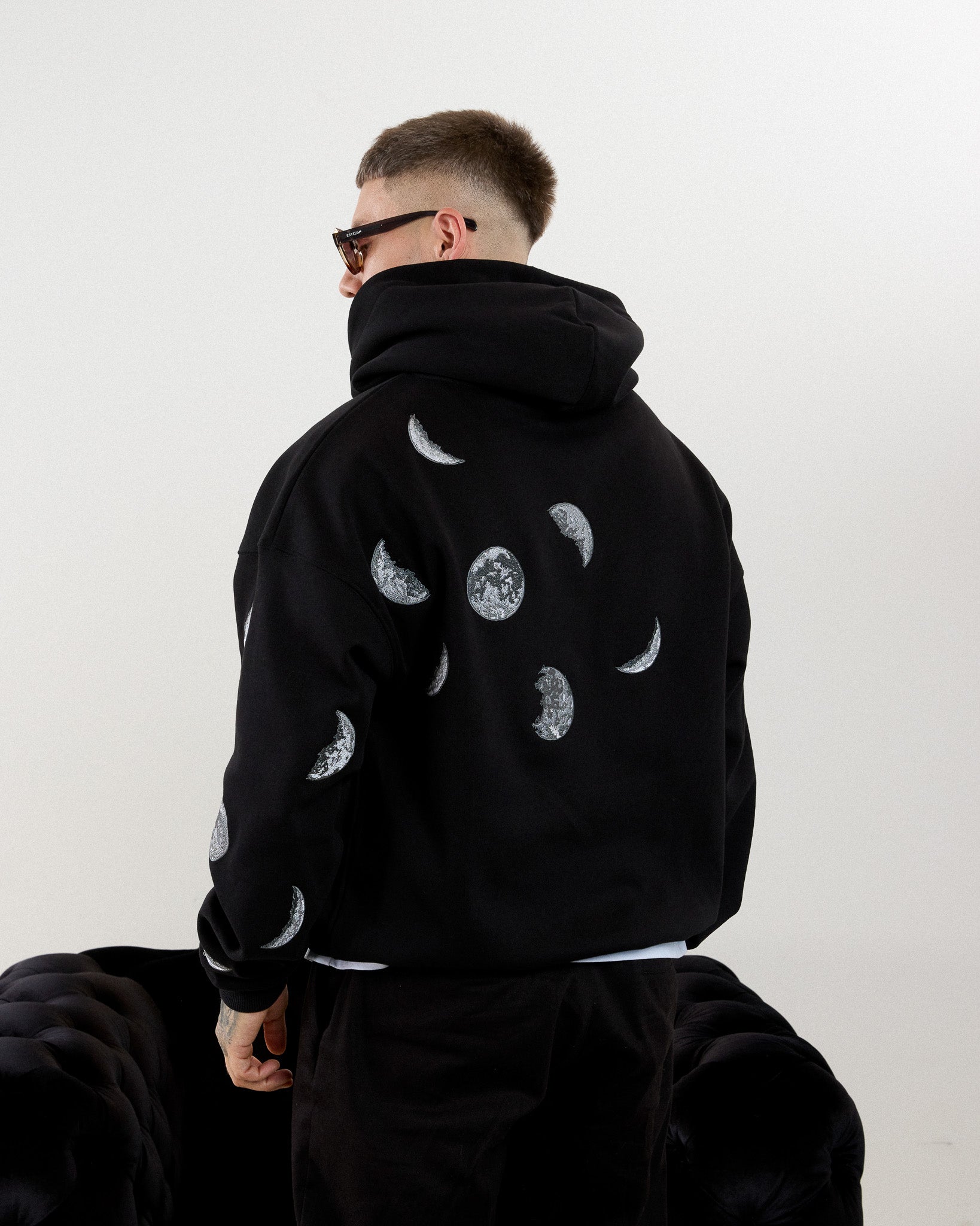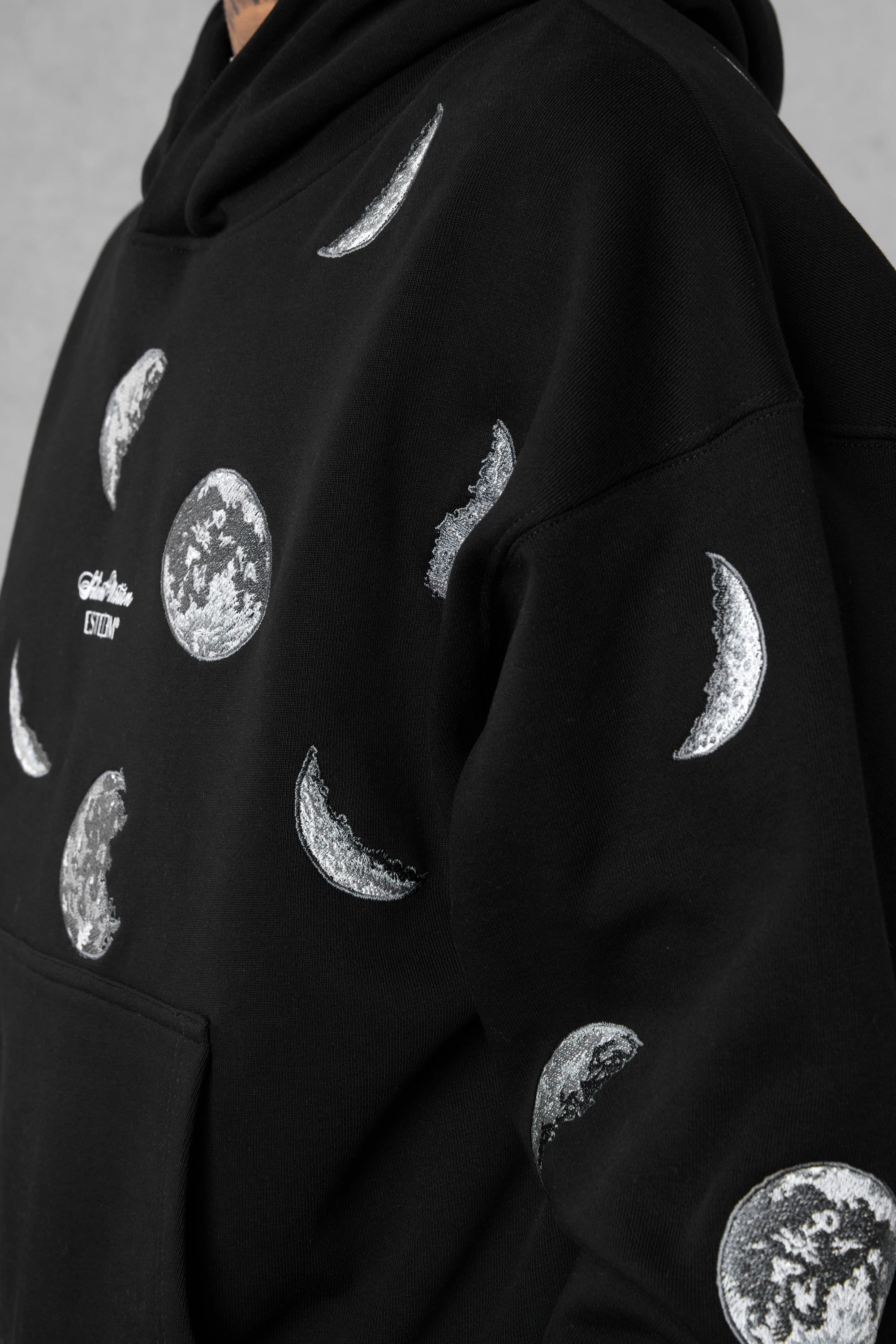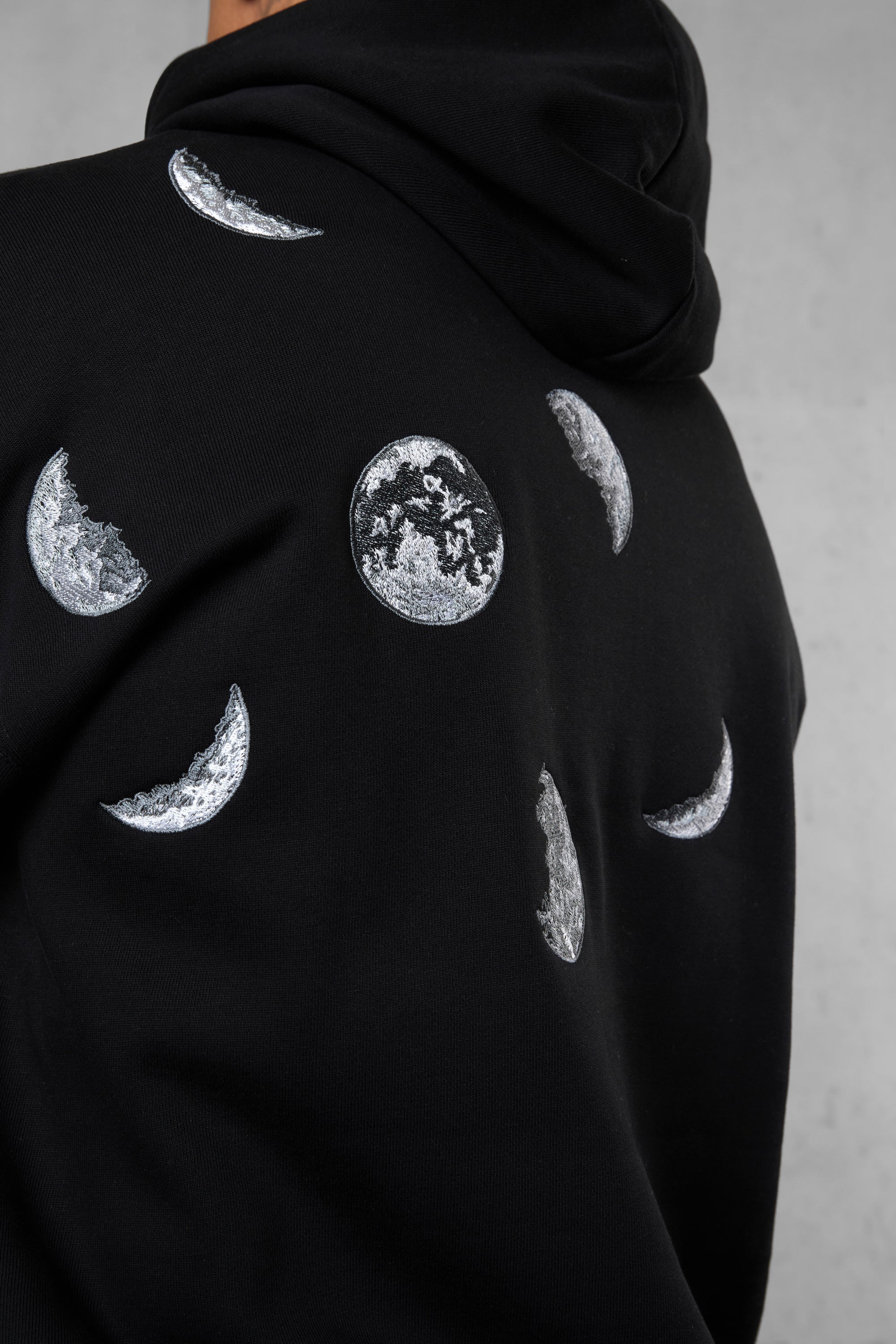 Une broderie minutieuse représentant les différentes phases de la lune. Une expression de calme et de mouvement.