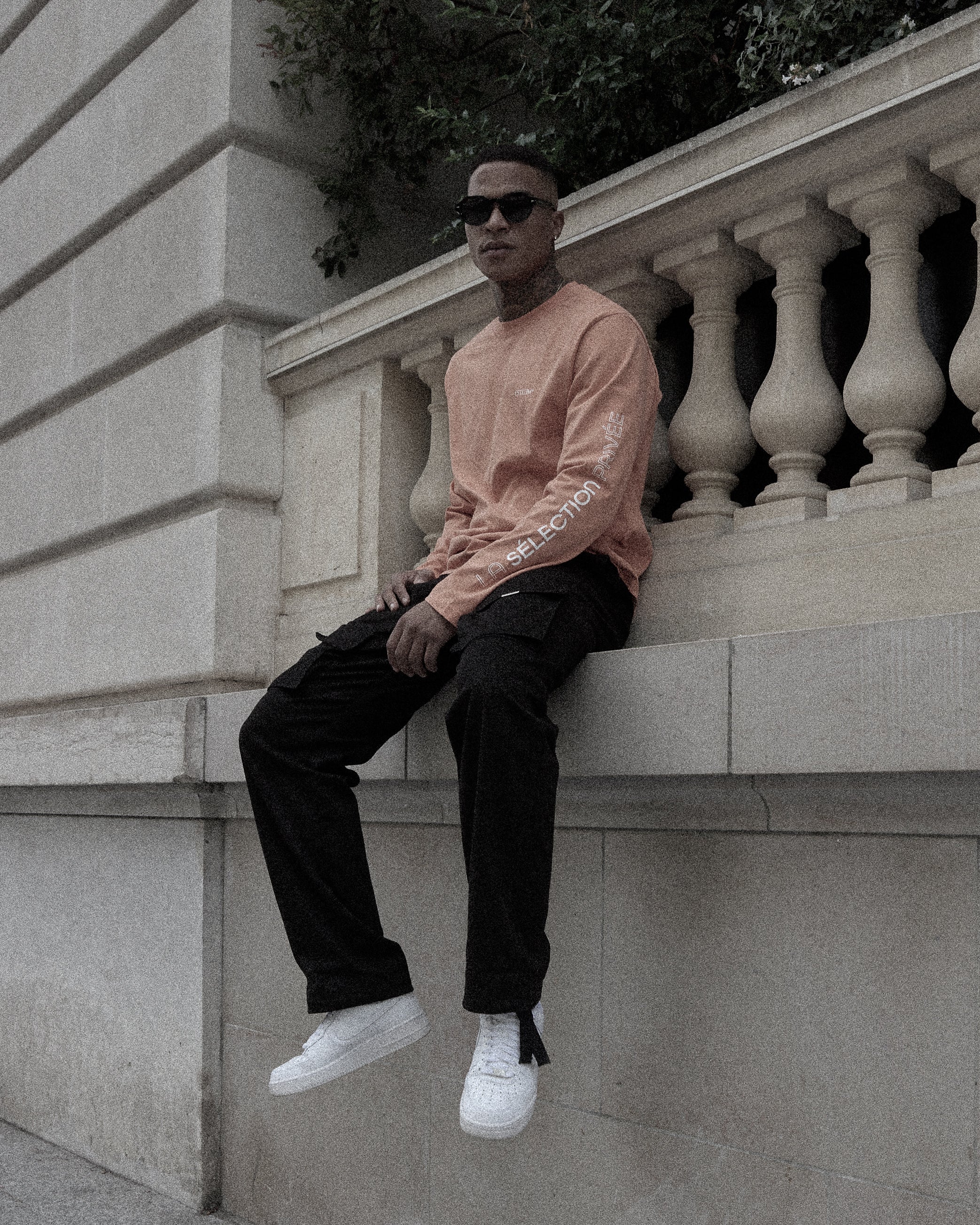 « La Sélection Privée » comme un imprimé marquant qui s’étend presque sur toute la longueur de la manche.