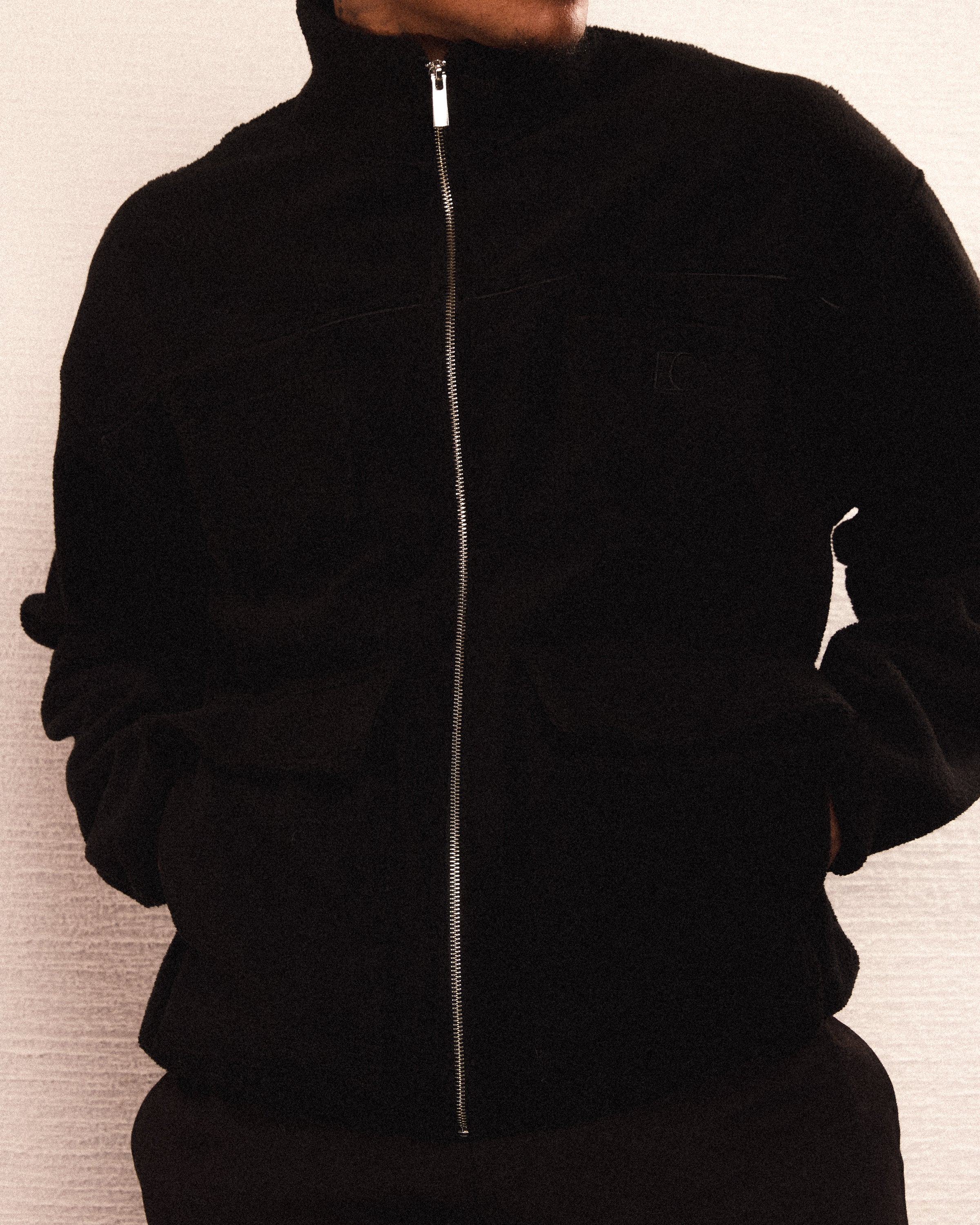 Premium teddy jacket crafted from soft, plush fabric. The high collar adds gentle warmth on cooler days, while the patch pockets complete the look.